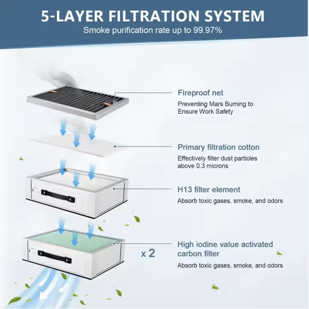 Fumes and debris are pulled through 1x spark filter, 1x pre-filter, 1x H13 HEPA filter, 2x activated carbon filter